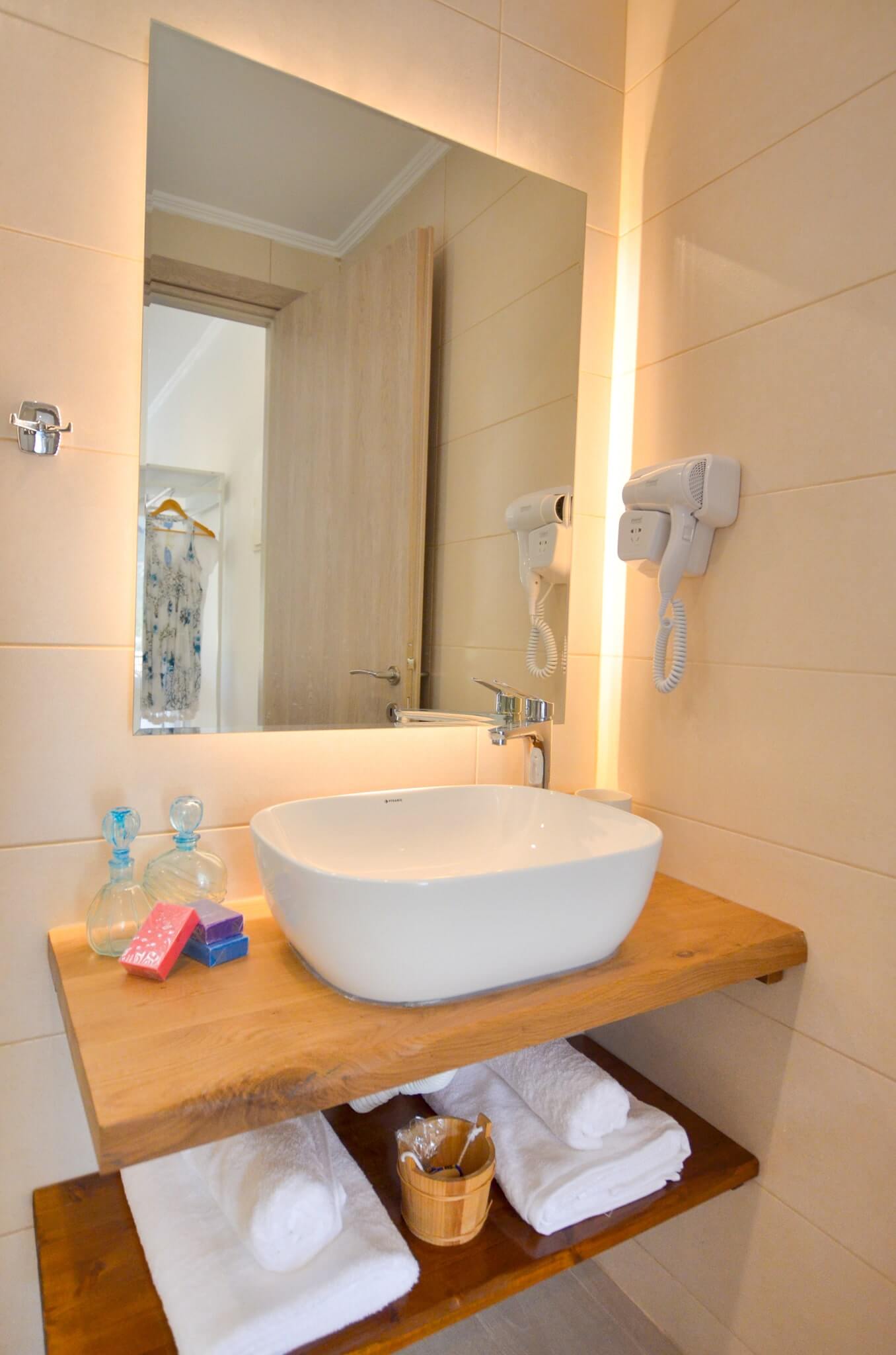 The room is located at the ground floor of the building and is accessible via stairs. To facilitate your move into the room, there is a special furniture for the suitcases, whereas the open wardrobe will help all your clothes stay wrinkle free during your stay! A practical wall mirror will assist you with your beauty regime.