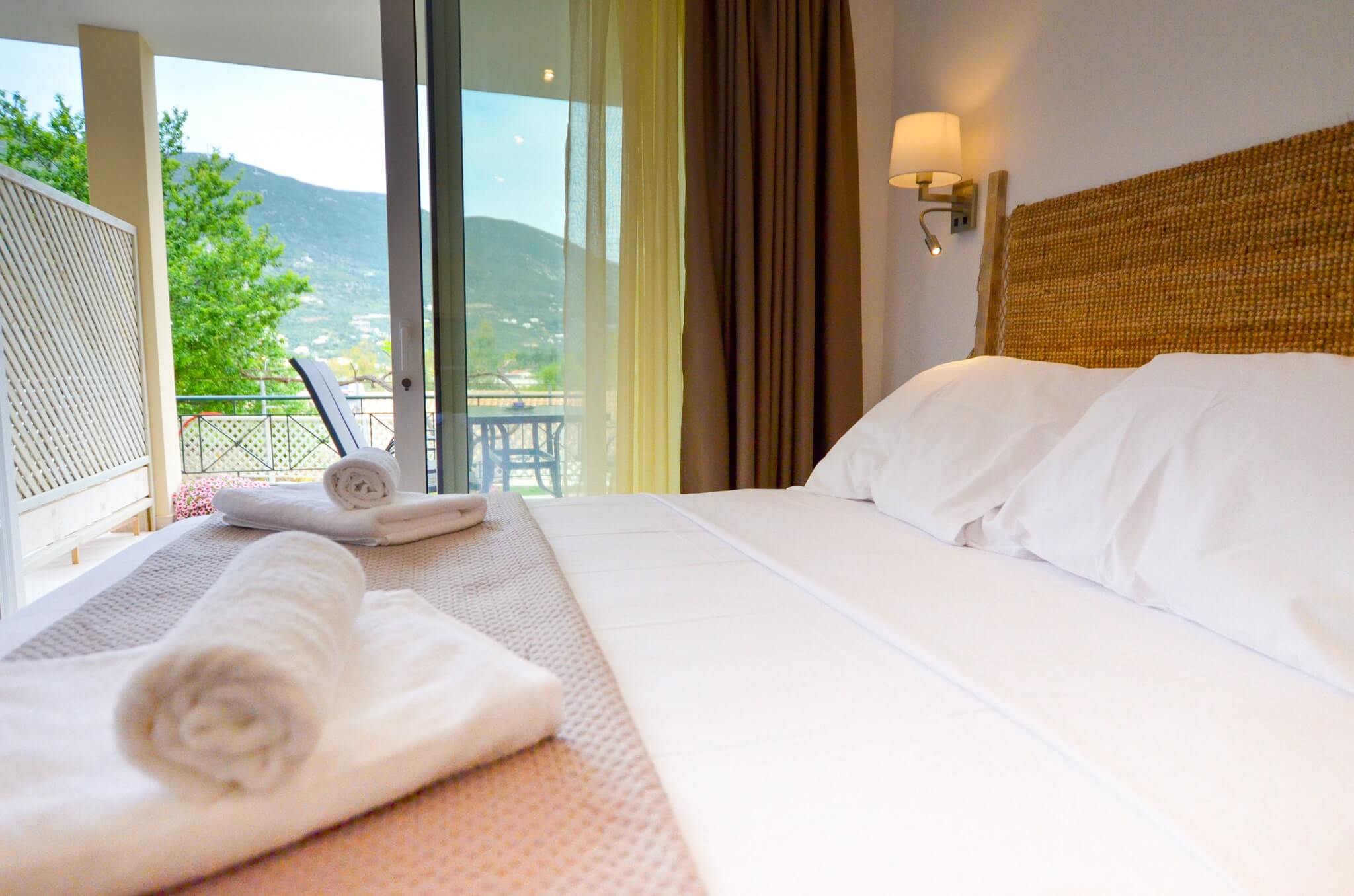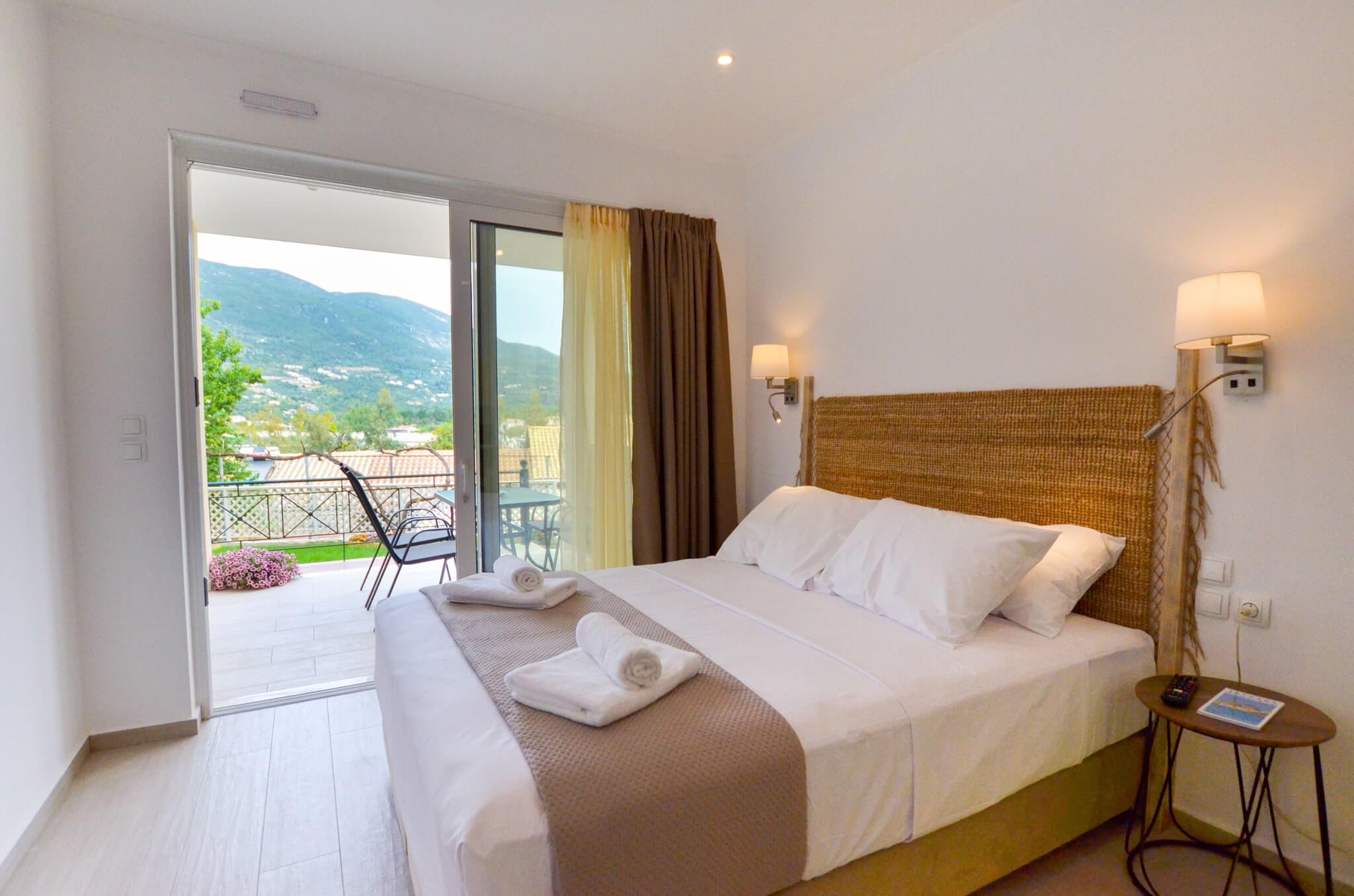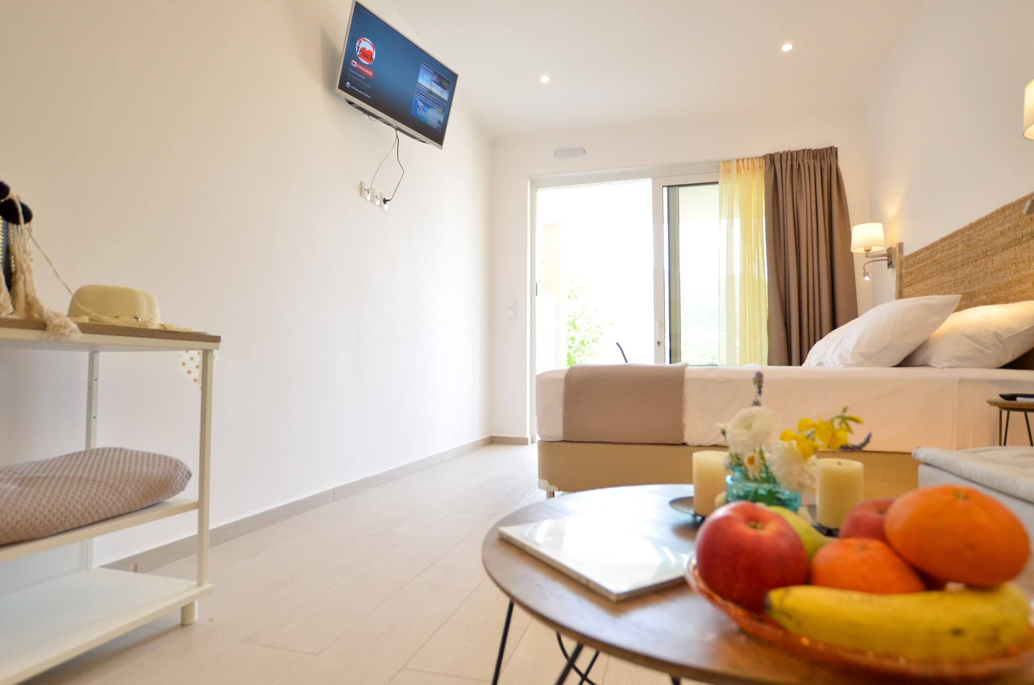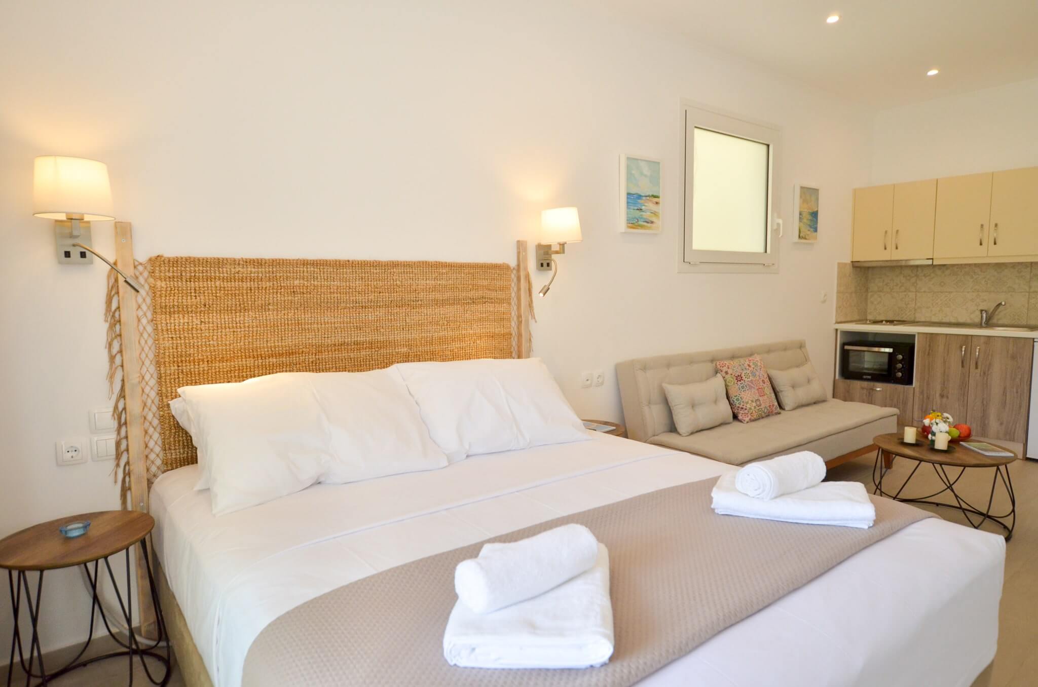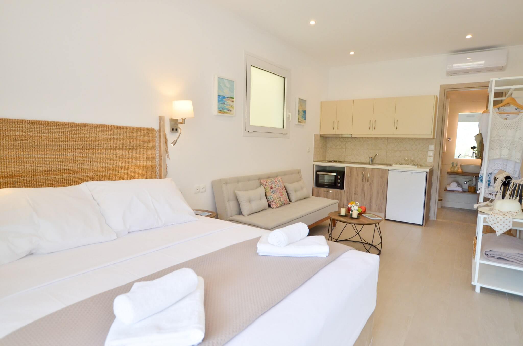 Studio (Ground Floor) is a 26 SQM and is mainly addressed to families of three ­members, groups or even couples who seek extra space and comfort in their room. The room features a large bed (King size) and a sofa bed. The room is overlooking the village of Vasiliki, has partial sea view and garden view. The large terrace offers a relaxing experience on summer nights.
