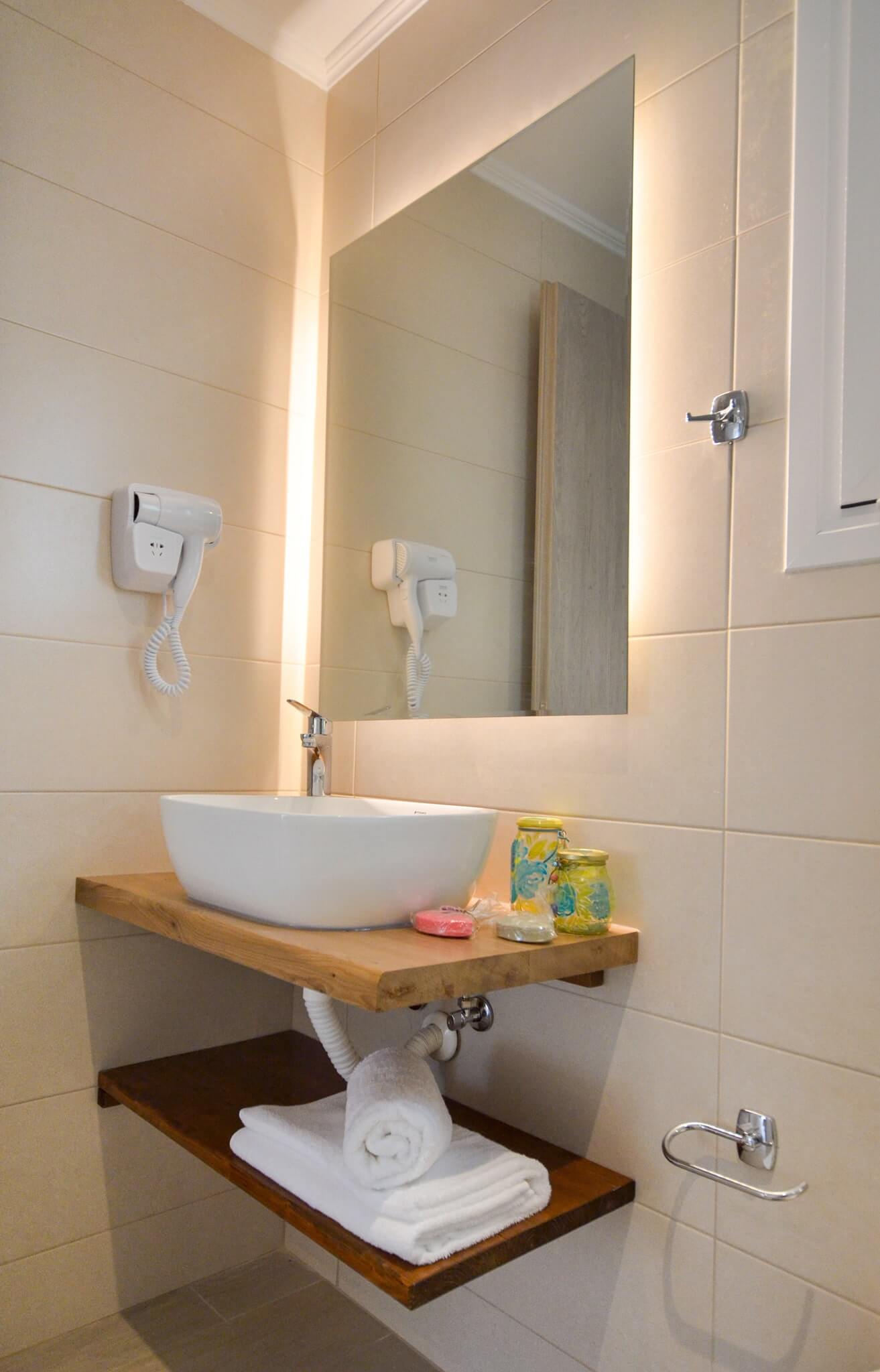 The room is located at the 1st floor of the building and is accessible via stairs. To facilitate your move into the room, there is a special furniture for the suitcases, whereas the open wardrobe will help all your clothes stay wrinkle free during your stay! A practical wall mirror will assist you with your beauty regime.