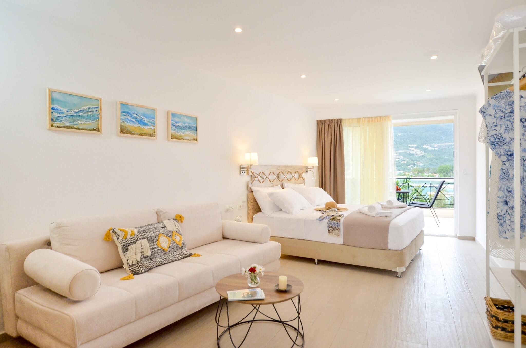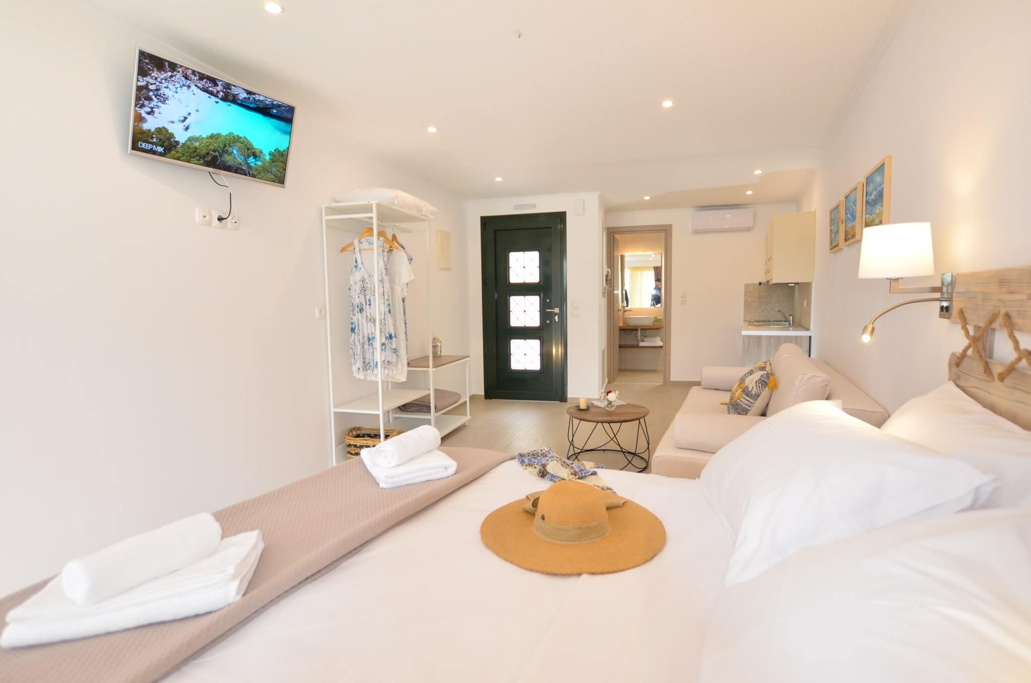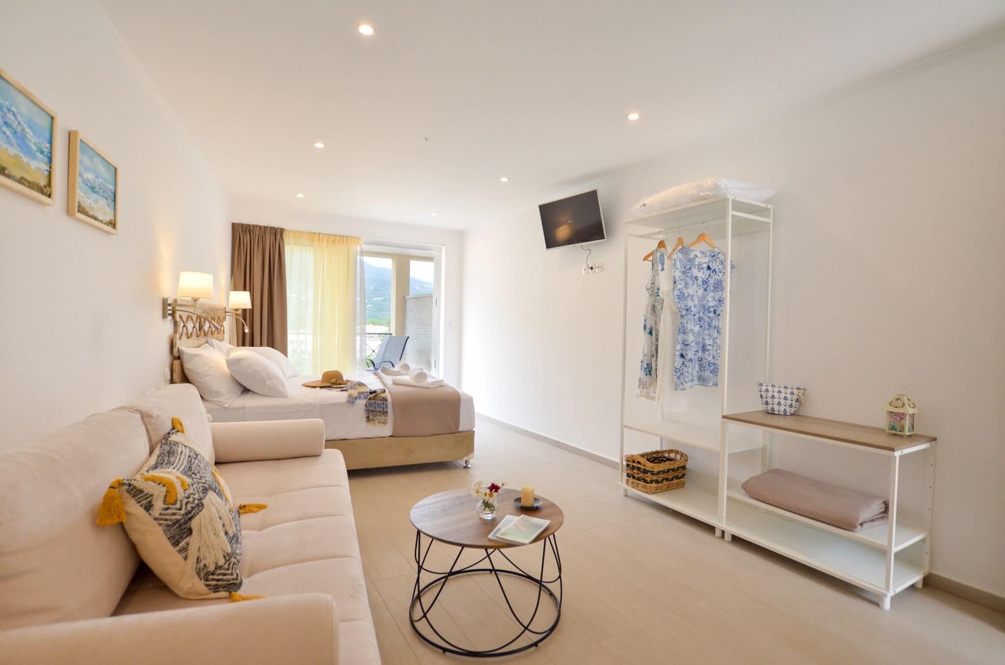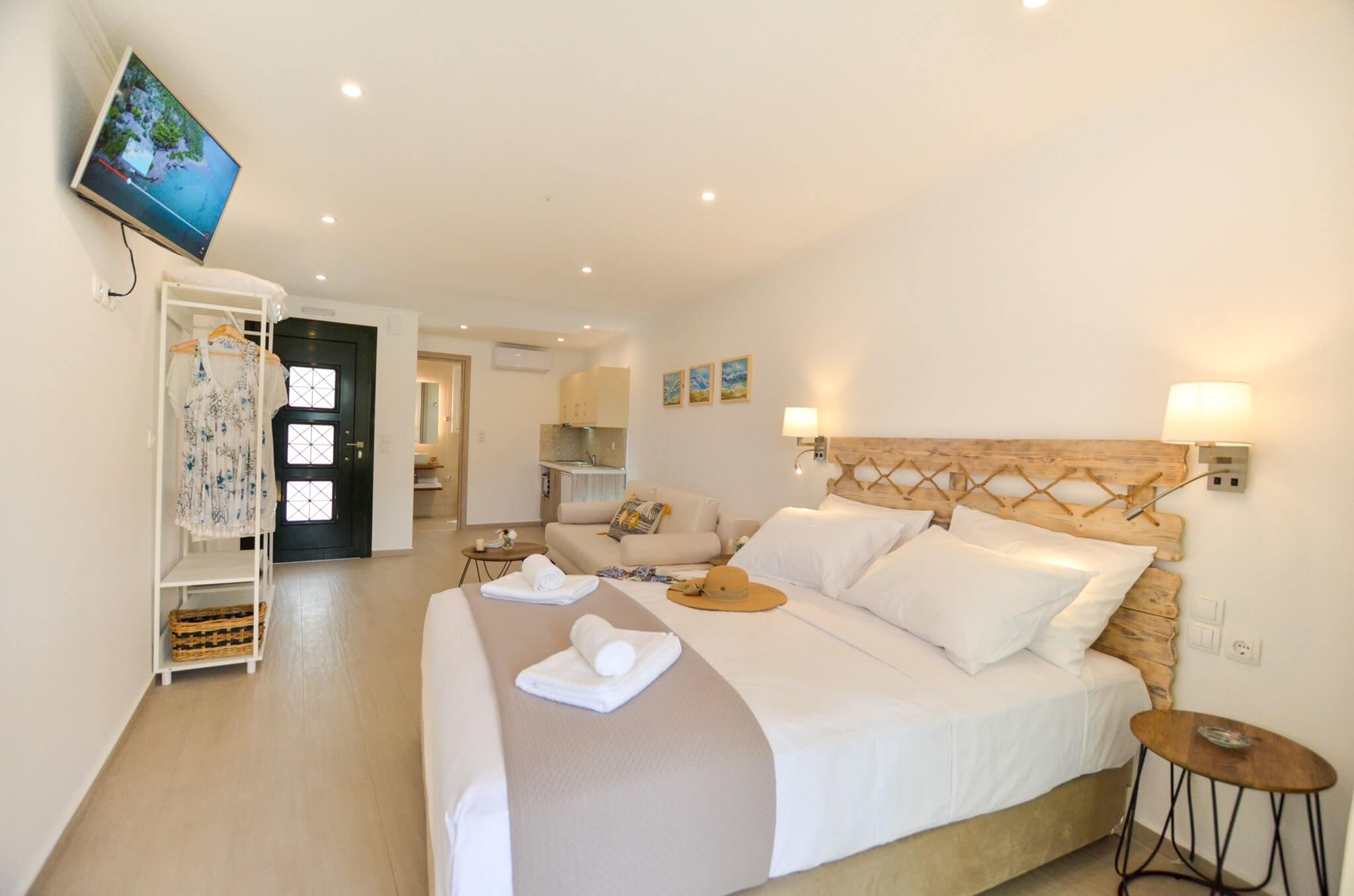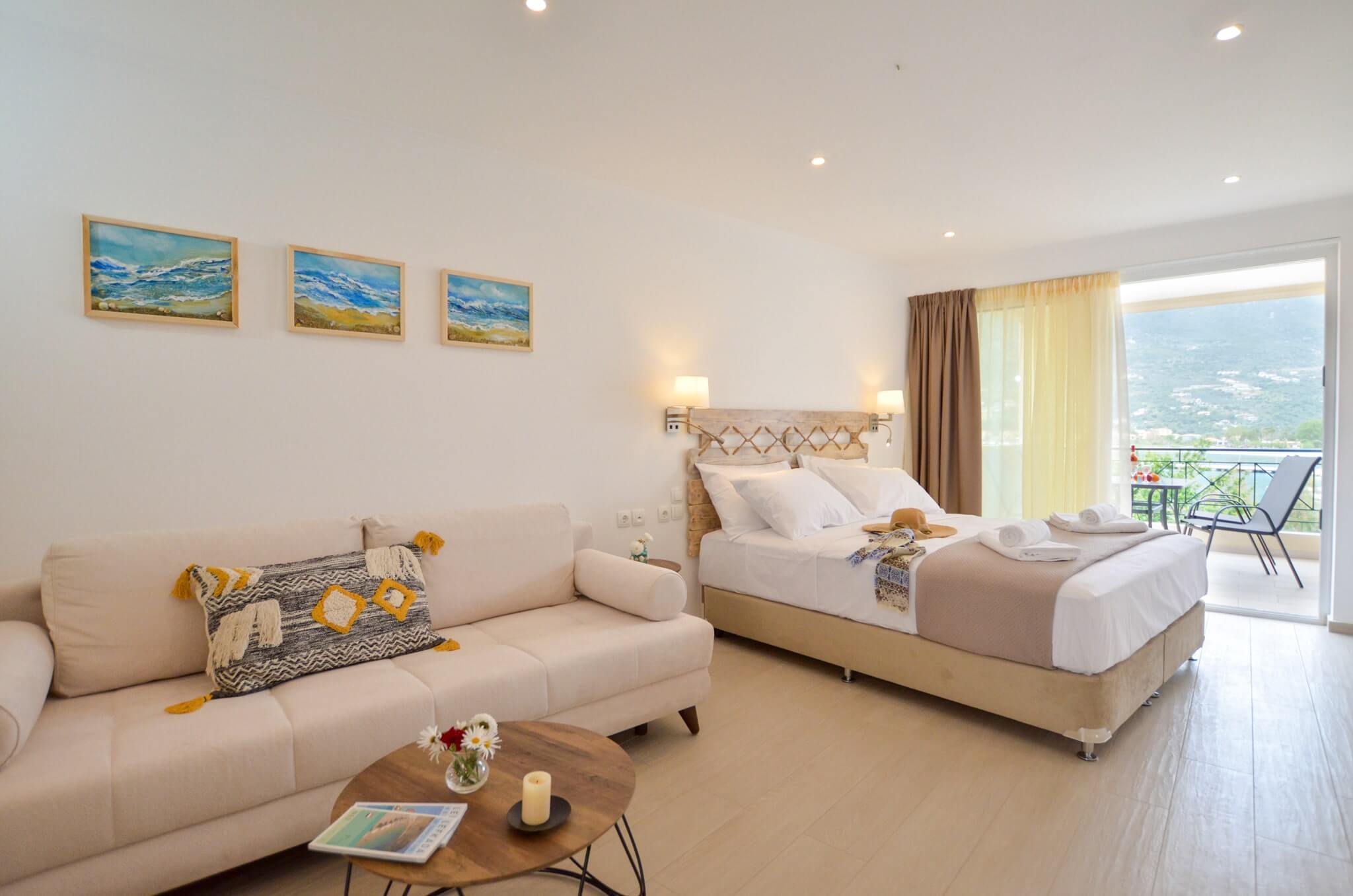 Superior Studio (1st floor) is a 30 SQM and is mainly addressed to families of three or four ­members, groups or even couples who seek extra space and comfort in their room. The room features a large bed (King size) and a double size sofa bed. The room is overlooking the village of Vasiliki, has wonderful sea view. The large terrace offers a relaxing experience on summer nights.