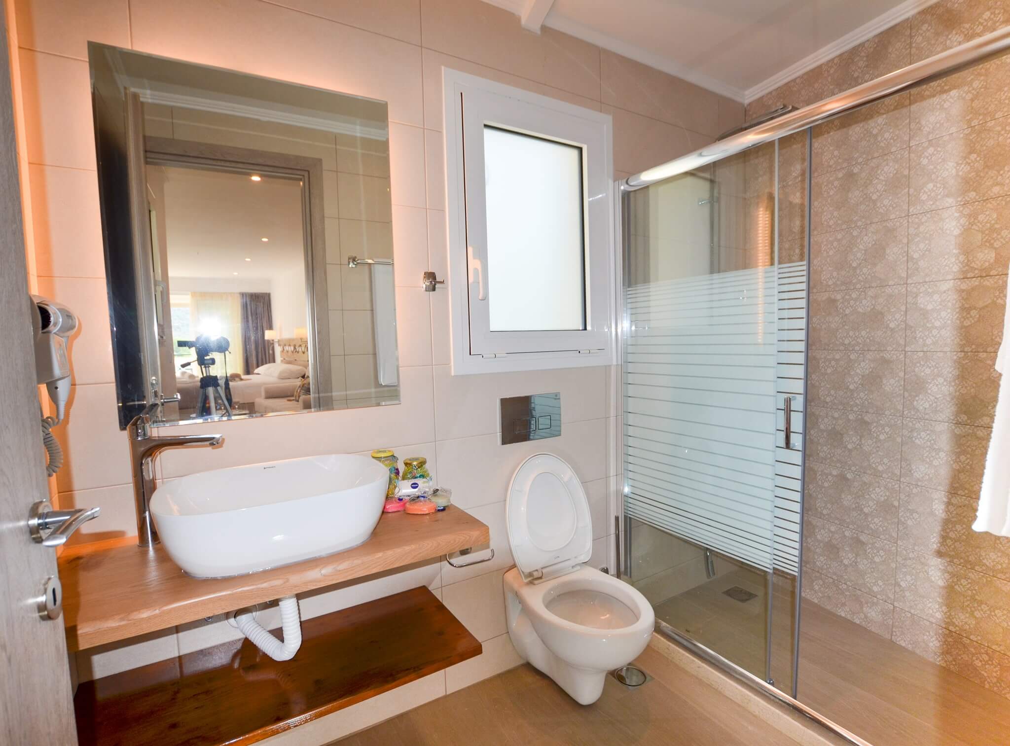 The room is located at the ground floor of the building and is accessible via stairs. To facilitate your move into the room, there is a special furniture for the suitcases, whereas the open wardrobe will help all your clothes stay wrinkle free during your stay! A practical wall mirror will assist you with your beauty regime.