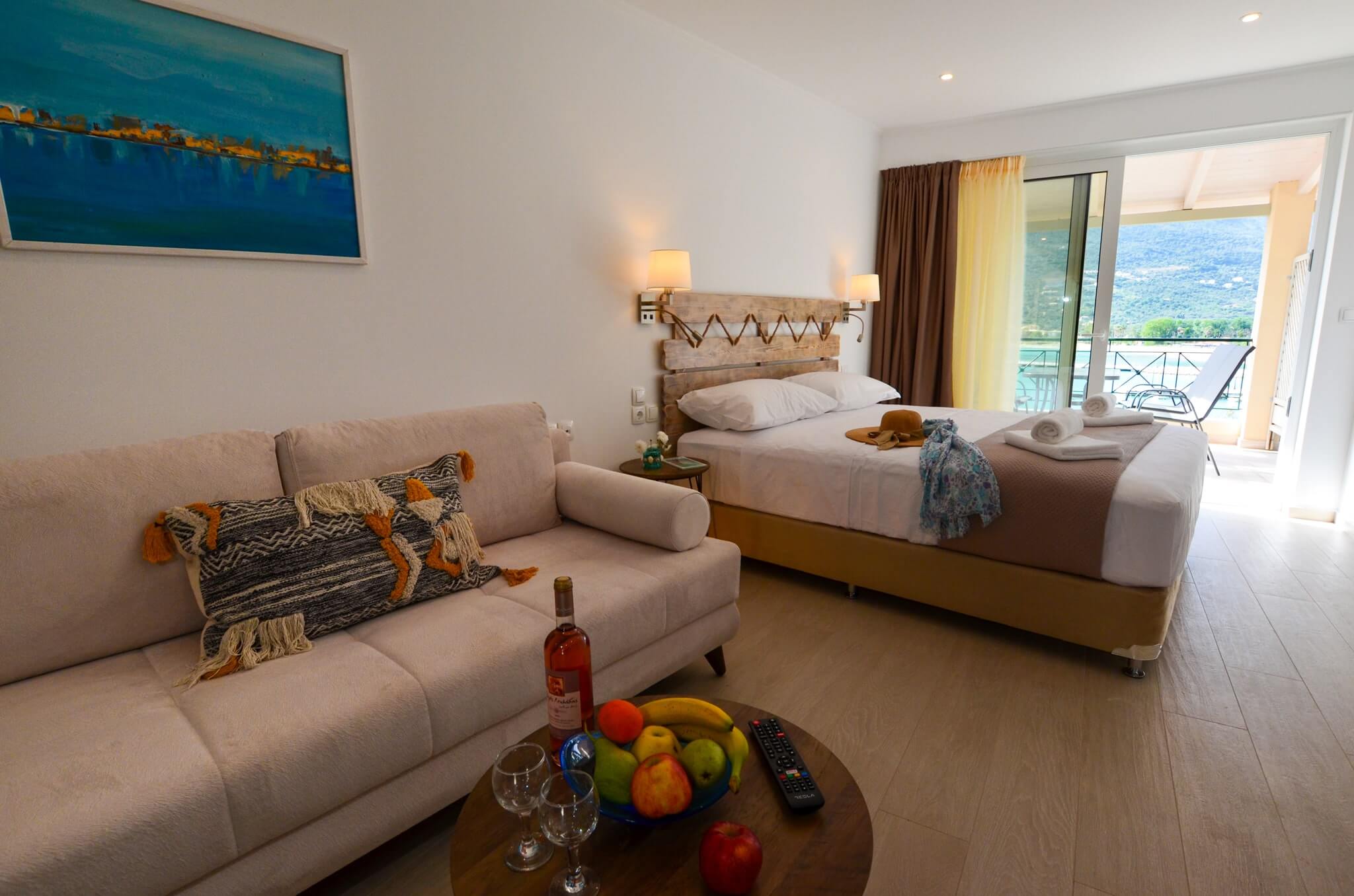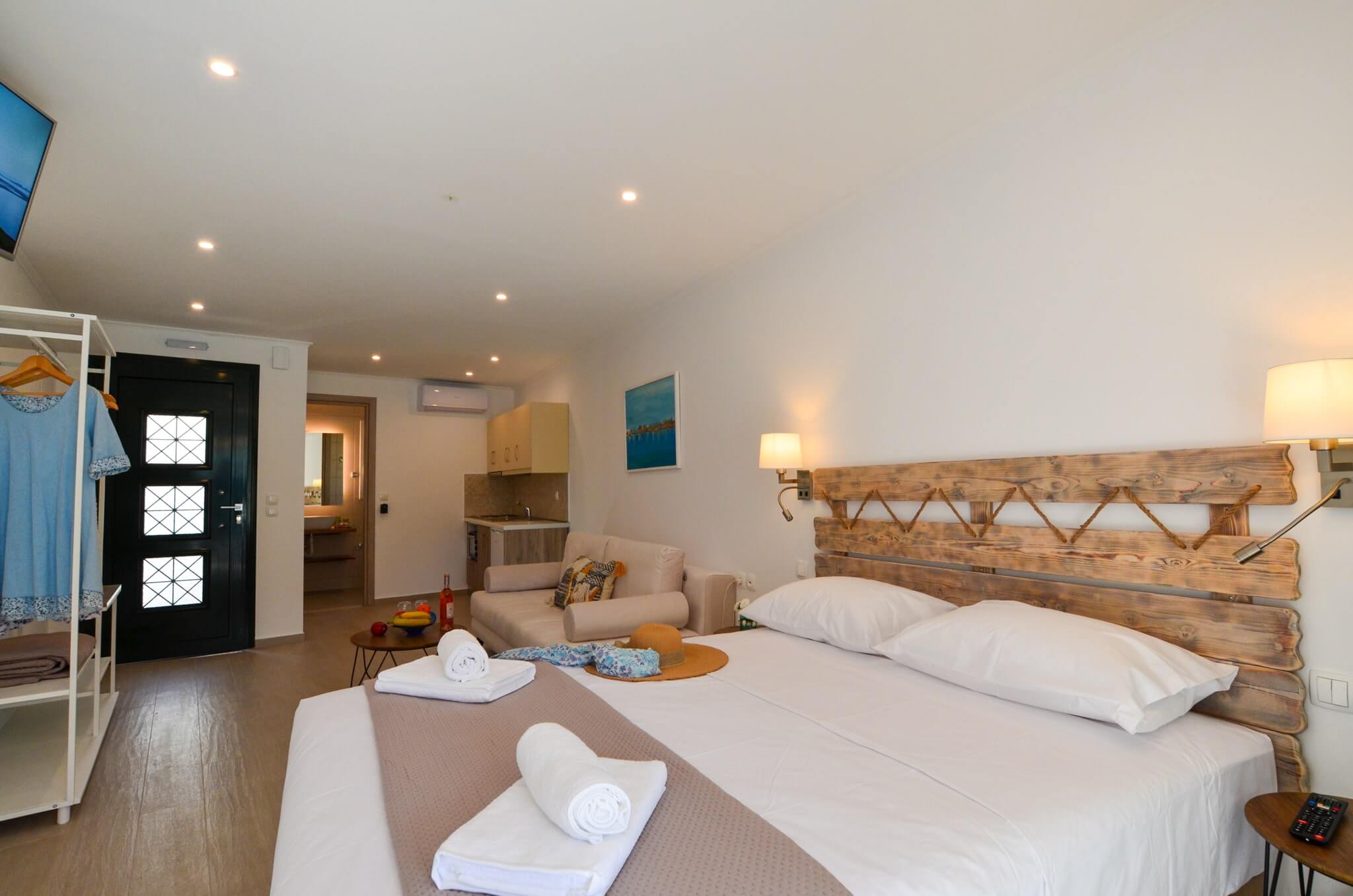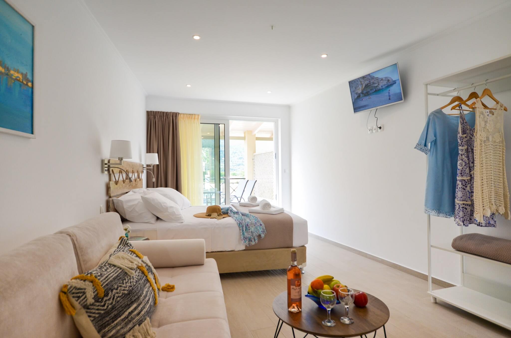 Superior Studio (2nd floor) is a 30 SQM and is mainly addressed to families of three or four ­members, groups or even couples who seek extra space and comfort in their room. The room features a large bed (King size) and a double size sofa bed. The room is overlooking the village of Vasiliki, has partial sea view and garden view. The large terrace offers a relaxing experience on summer nights.