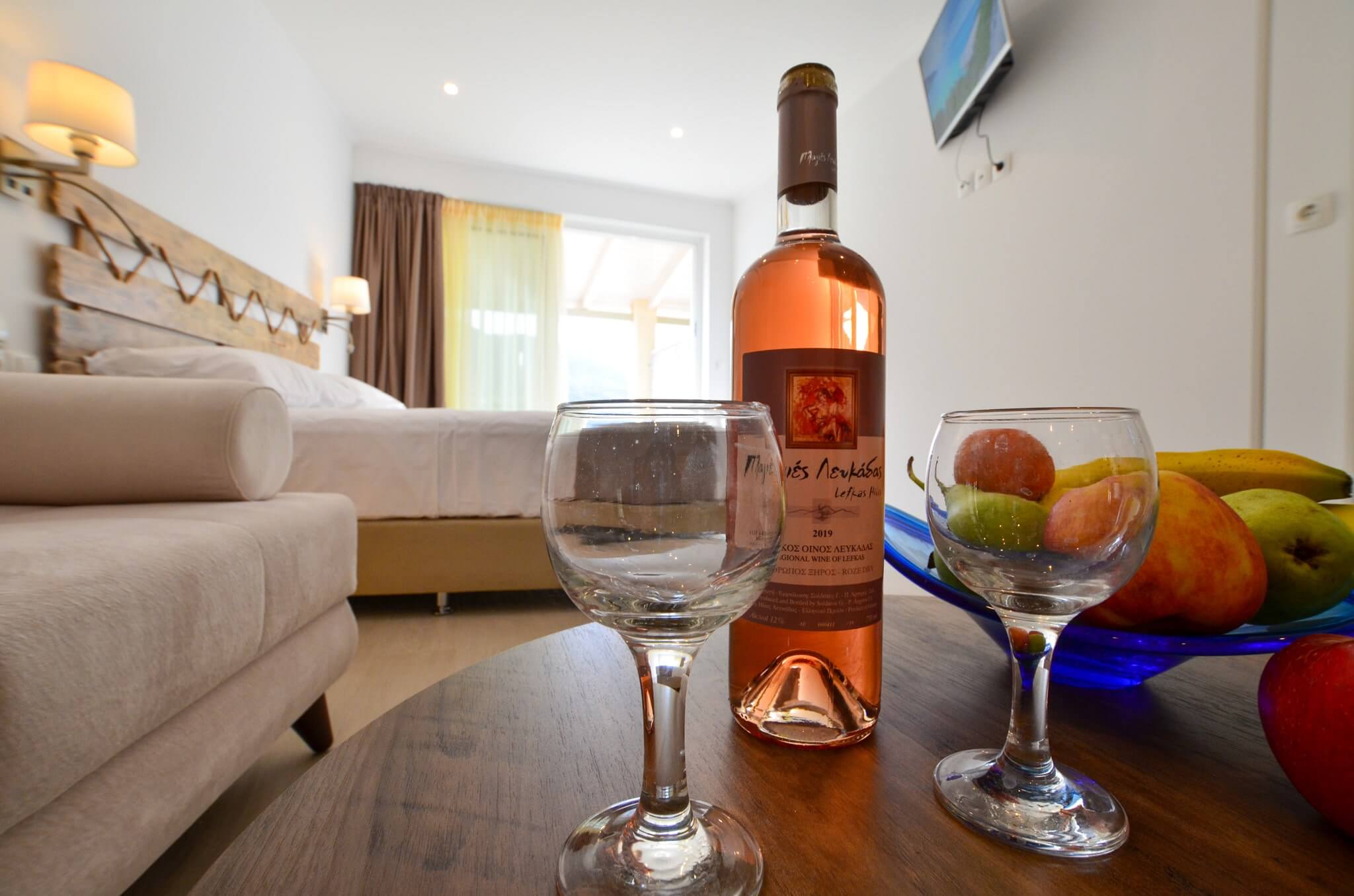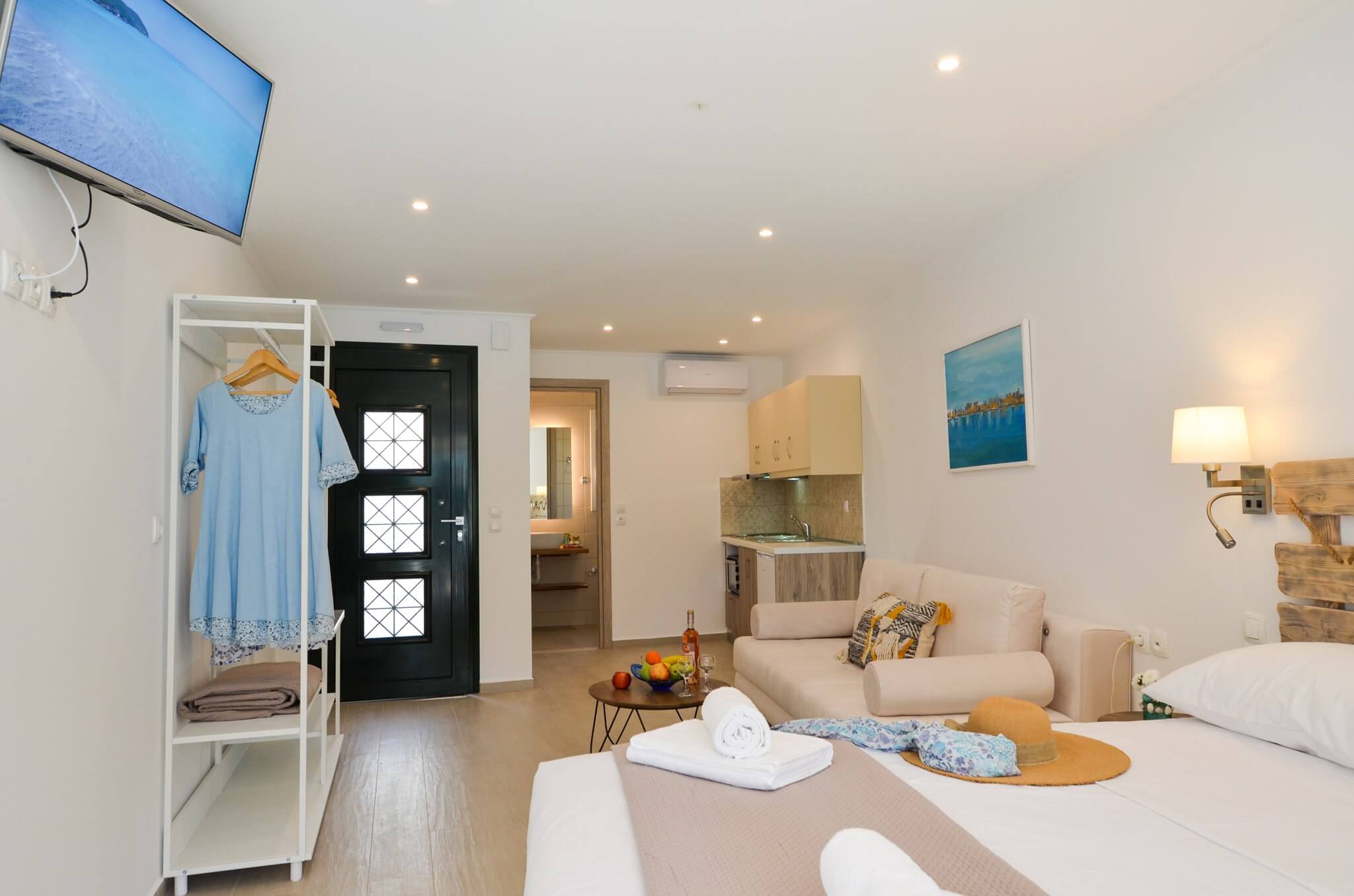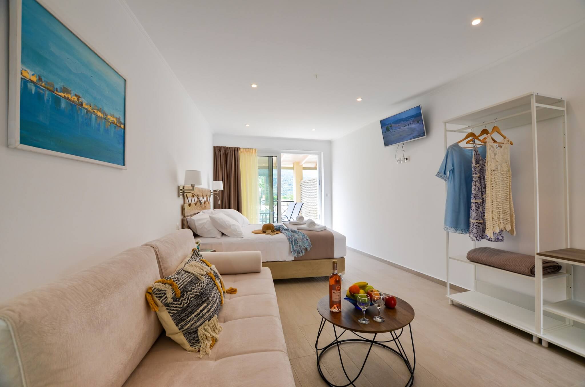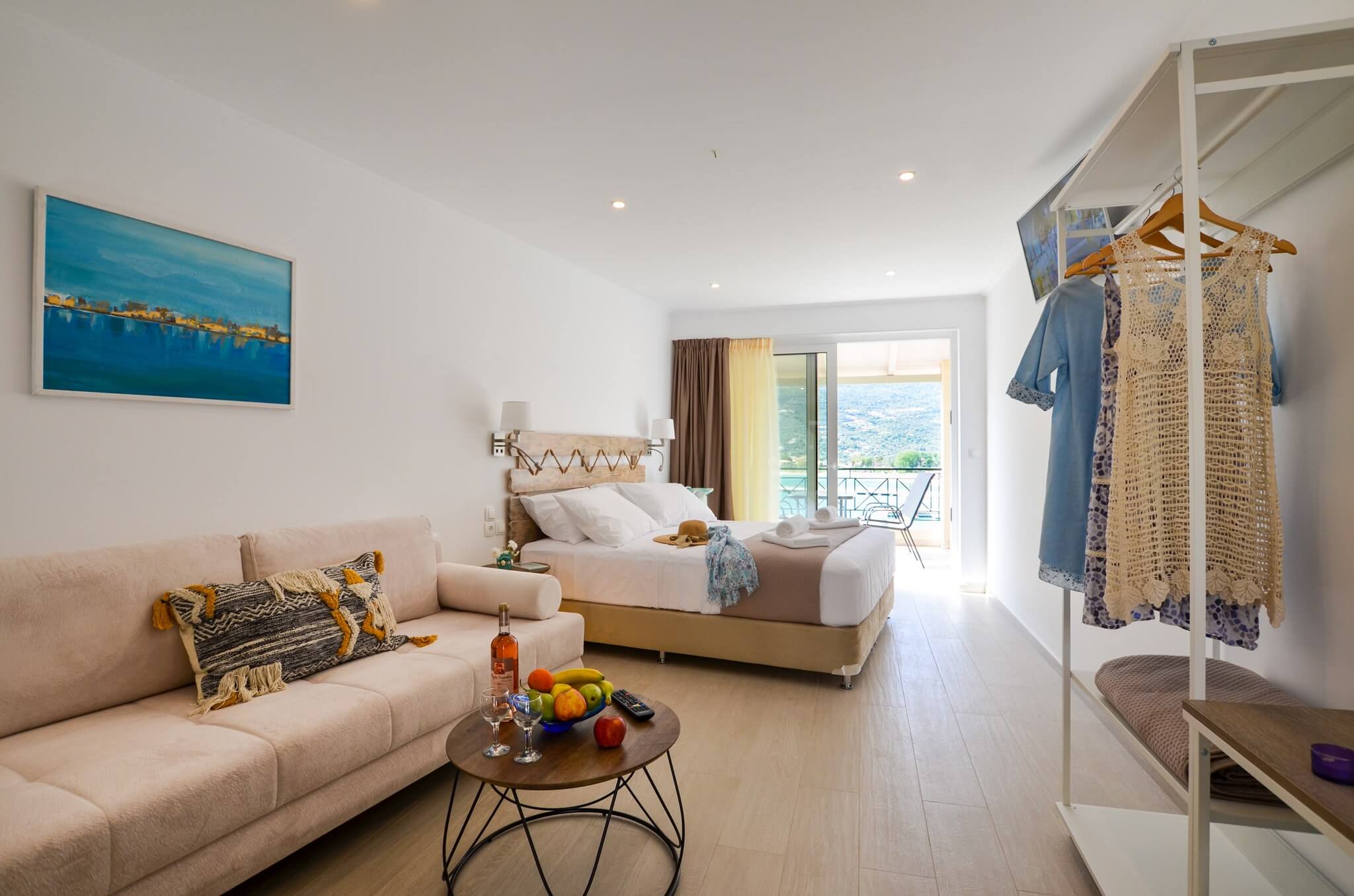 Superior Studio (2nd floor) is a 30 SQM and is mainly addressed to families of three or four ­members, groups or even couples who seek extra space and comfort in their room. The room features a large bed (King size) and a double size sofa bed. The room is overlooking the village of Vasiliki, has partial sea view and garden view. The large terrace offers a relaxing experience on summer nights.